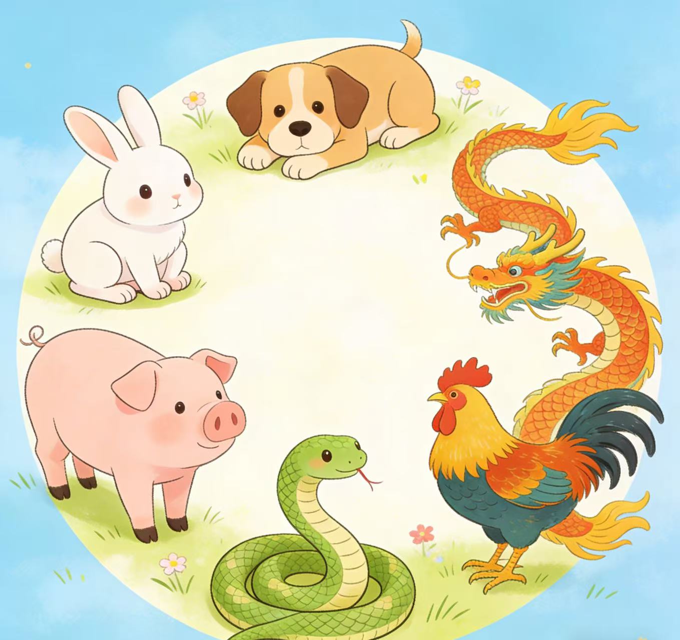左肖:鼠牛龙蛇猴鸡 右肖:虎兔马羊狗猪